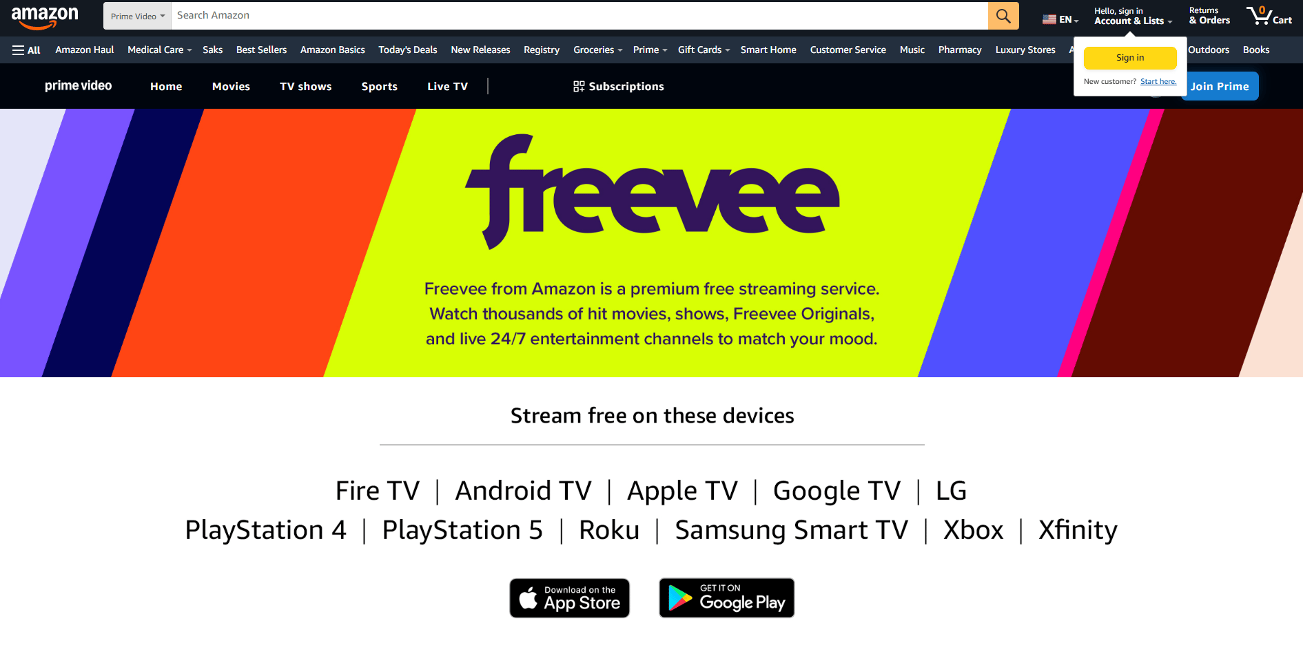 Amazon’s own free streaming service. Full shows, movies, and even originals — no Prime account needed.